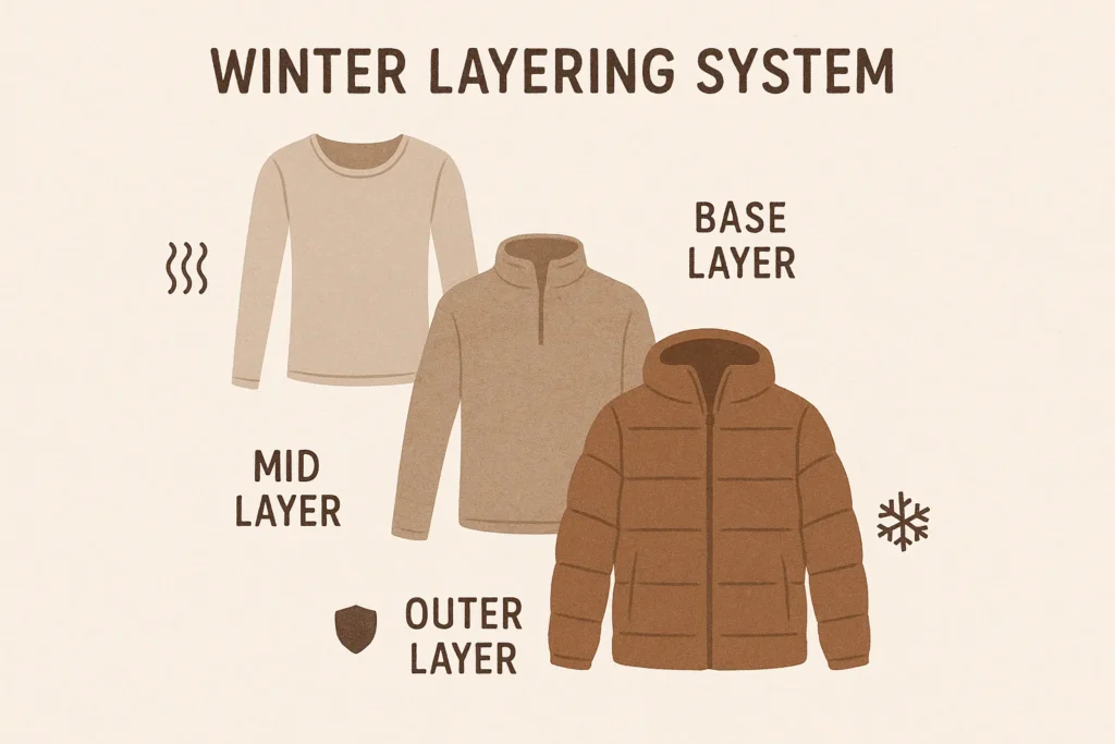 The most important concept in building winter outfits is layering. Layering is not simply stacking clothes on top of each other. It’s a thoughtful system where each piece plays a role in warmth, comfort, and weather protection. Many winter struggles shivering, sweating, overheating indoors, or feeling bulky come from wearing the wrong layers. When done correctly, you stay warm without feeling weighed down.