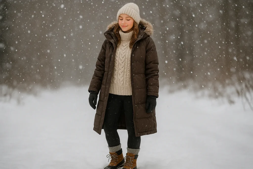 On snowy or freezing days, outfits become more heavy-duty. Layering a merino base underneath a chunky knit sweater and finishing with an insulated parka ensures warmth even in harsh conditions. Snow boots, wool socks, and gloves make this outfit extremely practical while still looking coordinated and intentional.