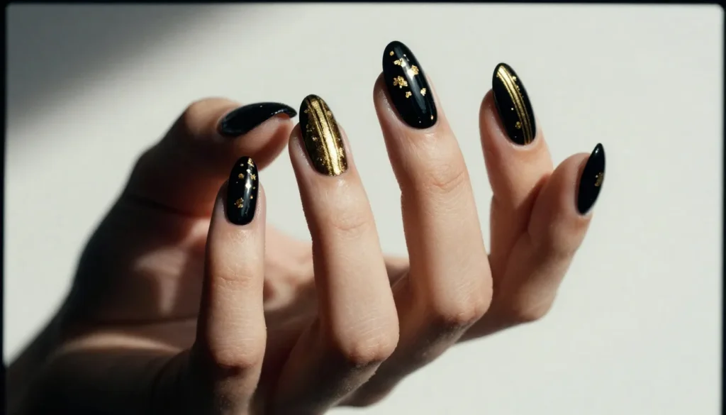 Gold is one of the most popular choices. It represents success, abundance, and optimism, and it pairs well with nearly every outfit. Silver offers a cooler, modern feel that works beautifully for minimalist or contemporary styles. Black nails remain a classic for their elegance and drama, especially when paired with glossy or shimmer finishes.